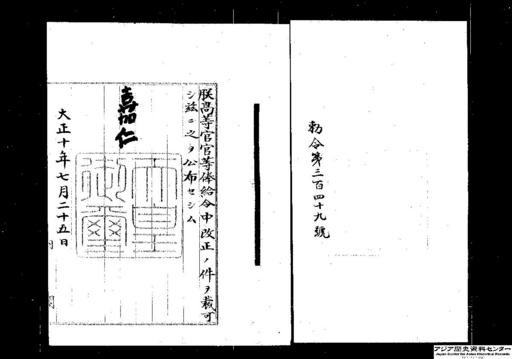 - 高等官官等俸給令中改正・御署名原本・大正十年・勅令第三百四十九号