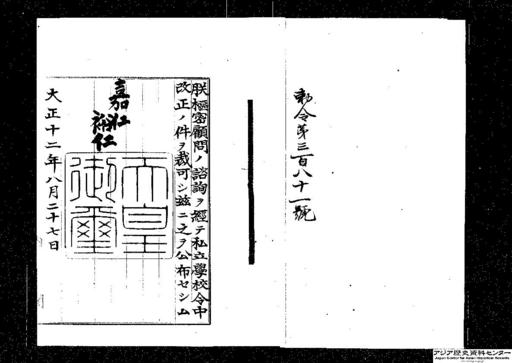 - 私立学校令中改正・御署名原本・大正十二年・勅令第三百八十一号