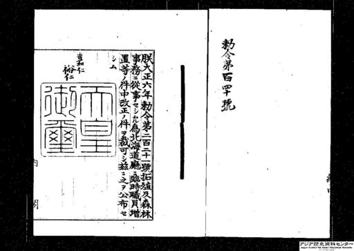 - 大正六年勅令第二百二十一号(拓殖及森林事務ニ従事セシムル為北海道庁ニ臨時職員増置等ノ件)中改正・御署名原本・大正十五年・勅令第一四〇号