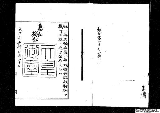 - 勅令第二百六十一号 朕一年志願兵及一年現役兵服役特例ヲ裁可シ茲ニ之ヲ公布セシム 嘉仁 裕仁 内閣総理大臣 若槻礼次郎 陸軍大臣 宇垣一成 一年志願兵及一年現役兵服役特例 左ニ掲クル学校ヲ卒業シ且当該学校ノ配属将校(陸軍現役将校学校配属令又ハ大正十四年勅令第二百四十六号ニ依リ学校ニ配属シタル現役将校ヲ謂フ以下之ニ同ジ)ニ於テ行フ教練ノ検定ニ合格シタル者ニシテ一年志願兵トシテ服役スル者ハ在営概ネ十月ノ後帰休セシム但シ一年志願兵条例第三十二条ノ規定ニ該当スル者ハ此ノ限ニ在ラズ 高等学校、大学令ニ依ル大学予科 専門学校、高等師範学校又ハ陸軍大臣ニ於テ之ト同等以上ト認ムル学校 中学校卒業ヲ入学程度トスル条業年限二年以上ノ学校 配属将校ニ於テ行フ教練ノ検定ニ合格シ