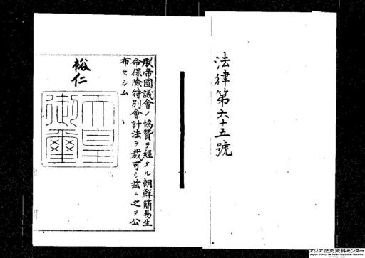 - 法律第六十五号 朕帝国議会ノ協贊ヲ経タル朝鮮簡易生命保険特別会計法ヲ裁可シ茲ニ之ヲ公布セシム 裕仁 内閣総理大臣男爵 田中義一 大藏大臣 三土忠造 朝鮮簡易生命保険特別会計法 朝鮮総督府ニ於テ簡易生命保険事業ヲ経営スル為特別会計ヲ設置シ其ノ歳入ヲ以テ歳出ニ充ツ 本会計ニ於テハ保険料、積立金ヨリ生ズル收入、毎年度予算ノ定ムル所ニ依リ朝鮮総督府特別会計ヨリ繰入ルル金額及附属雑收入ヲ以テ其ノ歳入トシ保険金、還付金、事業取扱費、営繕費其ノ他ノ諸費ヲ以テ其ノ歳出トス 本会計ニ於ケル歳入総額ノ歳出総額ニ超過スル金額ハ之ヲ積立ツベシ本会計ノ歳計ニ不足アルトキハ積立金ヨリ之ヲ補足スベシ 本会計ニ於テ支拂上現金ニ餘裕アルトキハ之ヲ大藏省預金部ニ預入ルルコトヲ得 政府ハ毎