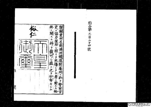 - 勅令第三百二十四号 朕関東州及南滿洲鐵道附属地ニ於テ警察官吏ニ協力援助シ因リテ死傷シタル者ニ対スル給与ニ関スル件ヲ裁可シ茲ニ之ヲ公布セシム 裕仁 内閣総理大臣 岡田啓介 大藏大臣 藤井真信 拓務大臣伯爵 児玉秀雄 関東州及南滿洲鐵道附属地ニ於テ職務ニ依ラズシテ警察官吏ニ協力援助シ因リテ死傷シタル者ニ対シテハ本令ノ定ムル所ニ依リ給与金ヲ給ス 給与金ヲ分チテ左ノ四種トス 葬祭料 遺族扶助料 傷痍扶助料 療治料 葬祭料ハニ十圓以上二百圓以下トシ死亡者ノ為葬祭ヲ營ム者ニ之ヲ給ス 遺族扶助料ハ五十圓以上五百圓以下トシ死亡者ノ遺族ニ之ヲ給ス 前項ノ遺族及其ノ遺族扶助料ヲ受クベキ順位ハ関東長官之ヲ定ム 遺族扶助料ヲ受クベキ順位ニ在ル者行衛不明ナルトキハ遺族扶助料ハ其