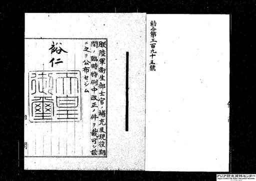 - 勅令第三百九十五号 朕陸軍衞生部士官ノ補充及現役期間ノ臨時特例中改正ノ件ヲ裁可シ茲ニ之ヲ公布セシム 裕仁 内閣総理大臣公爵 近衞文麿 陸軍大臣 杉山元 陸軍衛生部士官ノ補充及現役期間ノ臨時特例中左ノ通改正ス 「陸軍衛生部士官ノ補充及現役期間ノ臨時特例」ヲ「陸軍衛生部将校ノ補充及現役期間ノ臨時特例」ニ改ム 第二条第一項中「概ネ二月間」ヲ「概ネ一月間」ニ、同条第二項中「二等看護長」ヲ「衛生軍曹」ニ改ム 第三条中「見習医官」ヲ「衛生部見習士官」ニ改メ同条ニ左ノ一項ヲ加フ 前項ノ規定ニ依リ衛生部見習士官ヲ命ゼラレタル者ニ付テハ陸軍補充令第三十七条第一項ニ規定スル期間ハ之ヲ概ネ一月トス 第四条第一項中「前条ノ規定ニ依リ」ヲ「前条第一項ノ規定ニ依リ」ニ、「見習医官