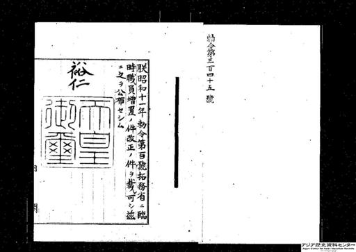 - 勅令第三百四十五号 朕昭和十一年勅令第百号拓務省ニ臨時職員増置ノ件改正ノ件ヲ裁可シ茲ニ之ヲ公布セシム 裕仁 内閣総理大臣公爵 近衞文麿 拓務大臣 大谷尊由 拓務部内臨時職員設置制 時局ニ緊要ナル物資ノ需給ノ調整ニ関スル事務ニ從事セシムル為拓務省ニ左ノ職員ヲ置キ殖産局ニ属セシム 事務官 専任三人 属専任三人 滿洲移植民ノ指導監督ニ関スル事務ニ從事セシムル為拓務省ニ左ノ職員ヲ置キ拓務局ニ属セシム 事務官 専任三人内一人ヲ勅任ト為スコトヲ得 理事官 専任一人 技師 専任三人 属 専任十三人 技手 専任七人 附則 本令ハ公布ノ日ヨリ之ヲ施行ス 昭和十三年六月三十日迄ハ第二条ノ規定ニ拘ラズ属ハ専任十二人、技手ハ専任六人ヲ以テ定員トス