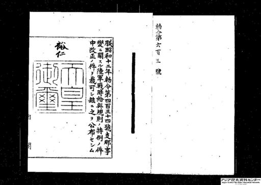 - 勅令第六百三号 朕昭和十二年勅令第四百三十四号支那事変ニ関スル陸軍戰時給与規則ノ特例ノ件中改正ノ件ヲ裁可シ茲ニ之ヲ公布セシム 裕仁 内閣総理大臣兼陸軍大臣 東条英機 昭和十二年勅令第四百三十四号中左ノ通改正ス 同令ニ左ノ題名ヲ附ス 大東亜戰争ニ関スル陸軍戰時給与規則ノ特例 「今囘ノ支那事変」ヲ「大東亜戰争」ニ改ム 第二号ヲ第四号、第三号ヲ第五号トシ第一号ヲ左ノ如ク改ム 陸軍戰時給与規則及本令ニ於テ俸給又ハ給料ト稱スルハ陸軍給与令第四条ノ二ノ規定ニ依ル俸給又ハ給料ヲ謂フ 戰地ニ出發スル者(内地途中ニ在ル者ヲ除ク)又ハ戰地ニ在ル者ニ対シ陸軍戰時給与規則第六条第一項又ハ第二項ノ規定ニ依リ増給スル額ハ准士官以上ニ在リテハ俸給十分ノ八(尉官又ハ准士官ニシテ月額百