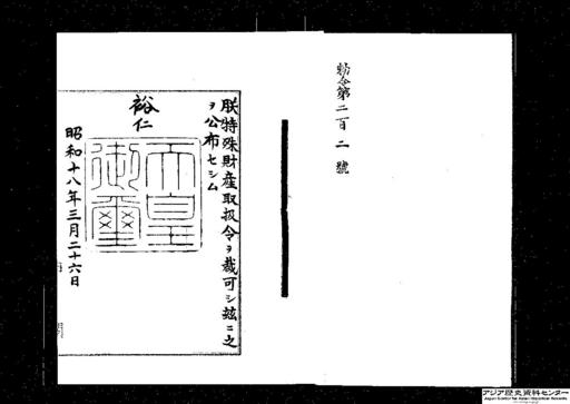 - 勅令第二百二号 朕特殊財産取扱令ヲ裁可シ茲ニ之ヲ公布セシム 裕仁 内閣総理大臣兼陸軍大臣 東条英機 海軍大臣 嶋田繁太郎 大藏大臣 賀屋興宣 大東亞大臣 青木一男 特殊財産取扱令 特殊財産資金ニ関スル財産(以下特殊財産ト稱ス)ハ大藏大臣之ヲ管理ス但シ現金、債券及出資ニ依ル権利以外ノ財産(本邦ニ在ルモノヲ除ク)ノ保管、運営及処分ニ関スル事務ニシテ軍政施行地域其ノ他命令ヲ以テ定ムル地域ニ在ル財産又ハ直接軍用ニ供スル財産ニ関スルモノニ付テハ陸軍大臣又ハ海軍大臣、其ノ他ノ財産ニ関スルモノニ付テハ大東亞大臣之ヲ管理ス 法人ノ出資者トシテノ議決権ハ前項ノ規定ニ拘ラス本店又ハ王タル事務所カ軍政施行地域其ノ他命令ヲ以テ定ムル地域ニ在ル法人ニ係ルモノニ付テハ陸軍大臣又ハ