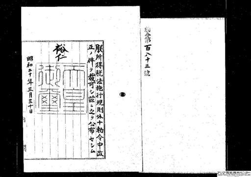 - 勅令第百八十三号 朕所得税法施行規則外十勅令中改正ノ件ヲ裁可シ茲ニ之ヲ公布セシム 裕仁 昭和二十年三月三十日 内閣総理大臣 小磯國昭 大東亜大臣 重光葵 大蔵大臣 津島壽一 第一条 所得税法施行規則中左ノ通改正ス 第九条 削除 第十条中「第十二条」ノ下ニ「第一項第一号、第四号又ハ第七号」ヲ加フ 第十二条ノ二 所得税法第十二条第一項第十号ノ規定ニ依リ取引一決済毎ノ収入金額ヨリ控除スベキ経費ハ当該取引ニ付納付スル取引税及当該取引ノ委託ニ付支払フ委託手数料ニ限ル 第二十一条中「法人ニ対スル」ノ下ニ「元本五千円ヲ超エザル」ヲ加ヘ「百分ノ二十ハ之ヲ百分ノ十五」ヲ「百分ノ二十三ハ之ヲ百分ノ七」ニ改ム 第二十一条ノ二中「百分ノ二十ハ之ヲ百分ノ五」ヲ「百分ノ二