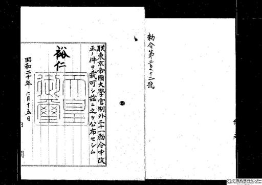 - 勅令第三百七十二号 朕東京帝国大学官制外二十一勅令中改正ノ件ヲ裁可シ茲ニ之ヲ公布セシム 裕仁 昭和二十年六月十五日 内閣総理大臣男爵 鈴木貫太郎 文部大臣 太田耕造 勅令第三百七十二号 第一条 東京帝国大学官制中左ノ通改正ス 第一条中「総長」ノ次ニ「事務監」ヲ加フ 第二条ノ二第一項中「三百四十四人」ヲ「三百五十人」ニ改メ同条ヲ第二条ノ三トス 第二条ノ二 事務監ハ一人勅任トス総長ノ命ヲ承ケ大学ノ事務ヲ掌理ス 第二条ノ三第一項中「二百九十三人」ヲ「二百九十九人」ニ改メ同条ヲ第二条ノ四トス 第三条中「総長」ヲ「上官」ニ改ム 第四条ノ三中「五百二十八人」ヲ「五百四十人」ニ改ム 第五条中「八十三人」ヲ「八十二人」ニ改ム 第五条ノ四中「七人」ヲ