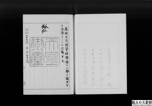 - 森林火災国営保険法の一部を改正する法律・御署名原本・昭和二十七年・法律第二五号