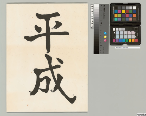 1989年1月7日、元号法の規定に基づいて、元号を「平成」と改める政令が閣議決定されました。同日、総理大臣官邸の記者会見室において、竹下登内閣の小渕恵三内閣官房長官が新元号を国民に発表しました。本資料は、このとき掲げられた「平成」の書です。 サイズ:横31cm 縦41.5cm