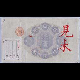明治16年(1883)3月、大蔵省から太政官へ提出された新十円札発行の伺書に添付された紙幣見本。デザインはイタリア人お雇い外国人のエドアルド・キヨソネ。表に「神功皇后」の肖像画。発行開始は、明治16年9月9日。通用停止は、同32年(1899)12月31日。本文書の含まれる「公文附属の図」は、平成10年「公文録」とともに、国の重要文化財に指定されました。