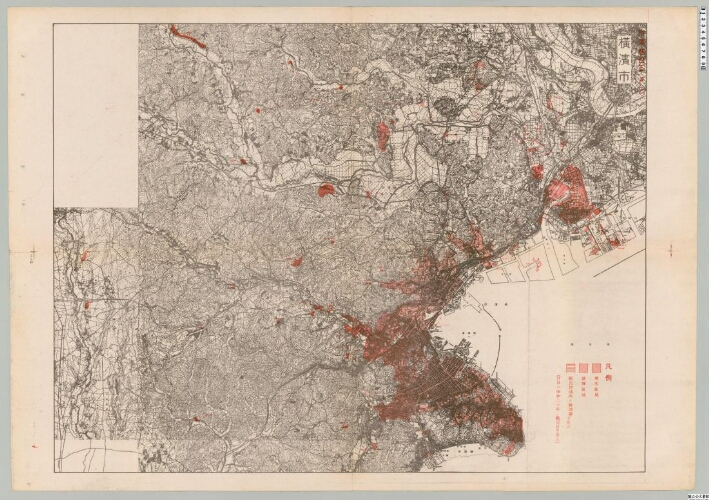 昭和20(1945)年12月、戦災の概況を復員帰還者に知らせるために、第一復員省資料課によって、全国主要都市戦災概況図は作成されました。まえがきには、当時帰還しつつあった復員軍人軍属の内地上陸にあたっての質問第一声が、概ねまず戦災概況についてであることを知り、この調査の重要性とその迅速な調整の必要とを痛感した、と述べられています。原図サイズ:108.5cm×76.5cm