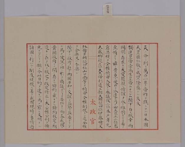 明治4年(1871年)、岩倉具視・木戸孝允・伊藤博文ら明治新政府のリーダーが、そろって横浜を出航、約1年10ヶ月をかけて1870年代初めの欧米を視察します。その目的は、条約締結各国への国書奉呈、条約改正の予備交渉、先進諸国の制度や文物の視察でした。岩倉使節団は、最初の訪問国であるアメリカ合衆国において、当初の条約改正の予備交渉という方針を変更し、直ちに改正交渉に入ることを決定しました。この方針変更の承認と全権委任状の下付を求めるため、大久保利通と伊藤博文が一時帰国します。明治5年5月14日、条約改正を行う権限がある「国書委任状」の下付を受け、再渡米しました。本文書の含まれる「公文附属の図」は、平成10年「公文録」とともに、国の重要文化財に指定されました。