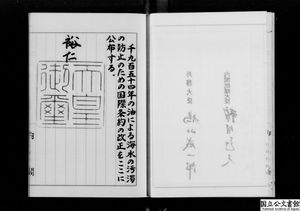 [簿冊]「千九百五十四年の油による海水の汚濁の防止のための国際条約の改正・御署名原本・昭和五十二年・第一〇巻・条約第四号」(御48665100)、国立公文書館デジタルアーカイブ、https://www.digital.archives.go.jp/file/3132334(参照 2026-04-10)