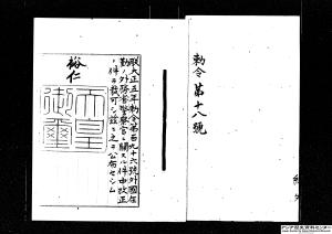 - 勅令第十八号 朕大正五年勅令第百九十六号外国在勤ノ外務省警察官ニ関スル件中改正ノ件ヲ裁可シ茲ニ之ヲ公布セシム 裕仁 内閣総理大臣 犬養毅 外務大臣 芳澤謙吉 大正五年勅令第百九十六号中左ノ通改正ス 第二条中「六人」ヲ「七人」ニ改ム 附則 本令ハ公布ノ日ヨリ之ヲ施行ス
