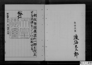 [Files] "郵政省設置法の一部を改正する法律・御署名原本・昭和四十七年・第四巻・法律第九二号", 御45740100, National Archives of Japan Digital Archive, https://www.digital.archives.go.jp/file/en/688656(accessed 2026-04-11)
