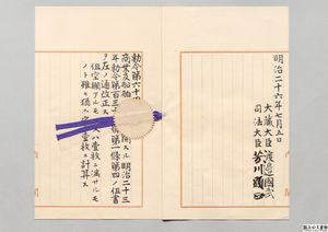 [簿冊]「明治二十三年勅令第百三十三号(商業及船舶ノ登記ニ関スル件)第一条中改正・御署名原本・明治二十六年・勅令第六十四号」(御01402100)、国立公文書館デジタルアーカイブ、https://www.digital.archives.go.jp/file/157807
