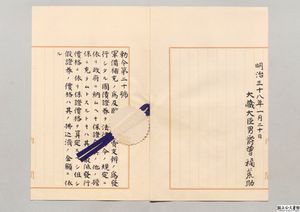 [簿冊]「担保トシテ政府ニ納ムヘキ国債証券ノ価格算定ニ関スル件・御署名原本・明治三十八年・勅令第二十号」(御06144100)、国立公文書館デジタルアーカイブ、https://www.digital.archives.go.jp/file/159624