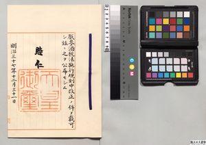 [簿冊]「麦酒税法施行規則中改正加除・御署名原本・明治三十八年・勅令第五号」(御06129100)、国立公文書館デジタルアーカイブ、https://www.digital.archives.go.jp/file/160613