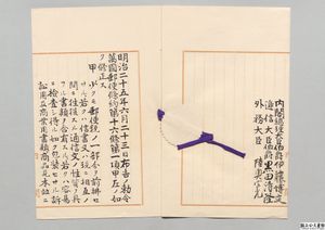 [Files] "万国郵便条約第十六条中修正・御署名原本・明治二十七年・条約二月六日", 御01859100, National Archives of Japan Digital Archive, https://www.digital.archives.go.jp/file/en/156825