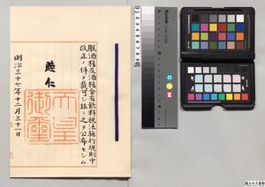 [Files] "酒精及酒精含有飲料税法施行規則中改正加除・御署名原本・明治三十八年・勅令第四号", 御06128100, National Archives of Japan Digital Archive, https://www.digital.archives.go.jp/file/en/159617