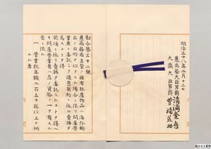[Files] "農商務省主管ノ国有林産物品ヲ問屋営業者ニ委托シテ随意契約ニ依ル売払ヲ為スコトヲ得ルノ件・御署名原本・明治三十八年・勅令第三十二号", 御06156100, National Archives of Japan Digital Archive, https://www.digital.archives.go.jp/file/en/159693